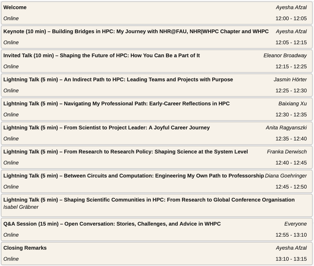 On March 9, 2026, the NHR|WHPC Chapter will host the special online event “She Computes: Celebrating Career Journeys in WHPC” to celebrate International Women’s Day. It will take place from 12:00–13:15 CET, featuring a keynote by Ayesha Afzal (NHR@FAU), an invited talk by Eleanor Broadway, and six lightning talks by Jasmin Hörter (KIT), Baixiang Xu (TU Darmstadt), Anita Rágyanszki (ZIB), Franka Derwisch (NHR Alliance), Diana Goehringer (TU Dresden), and Isabel Gräbner (ISC Group).