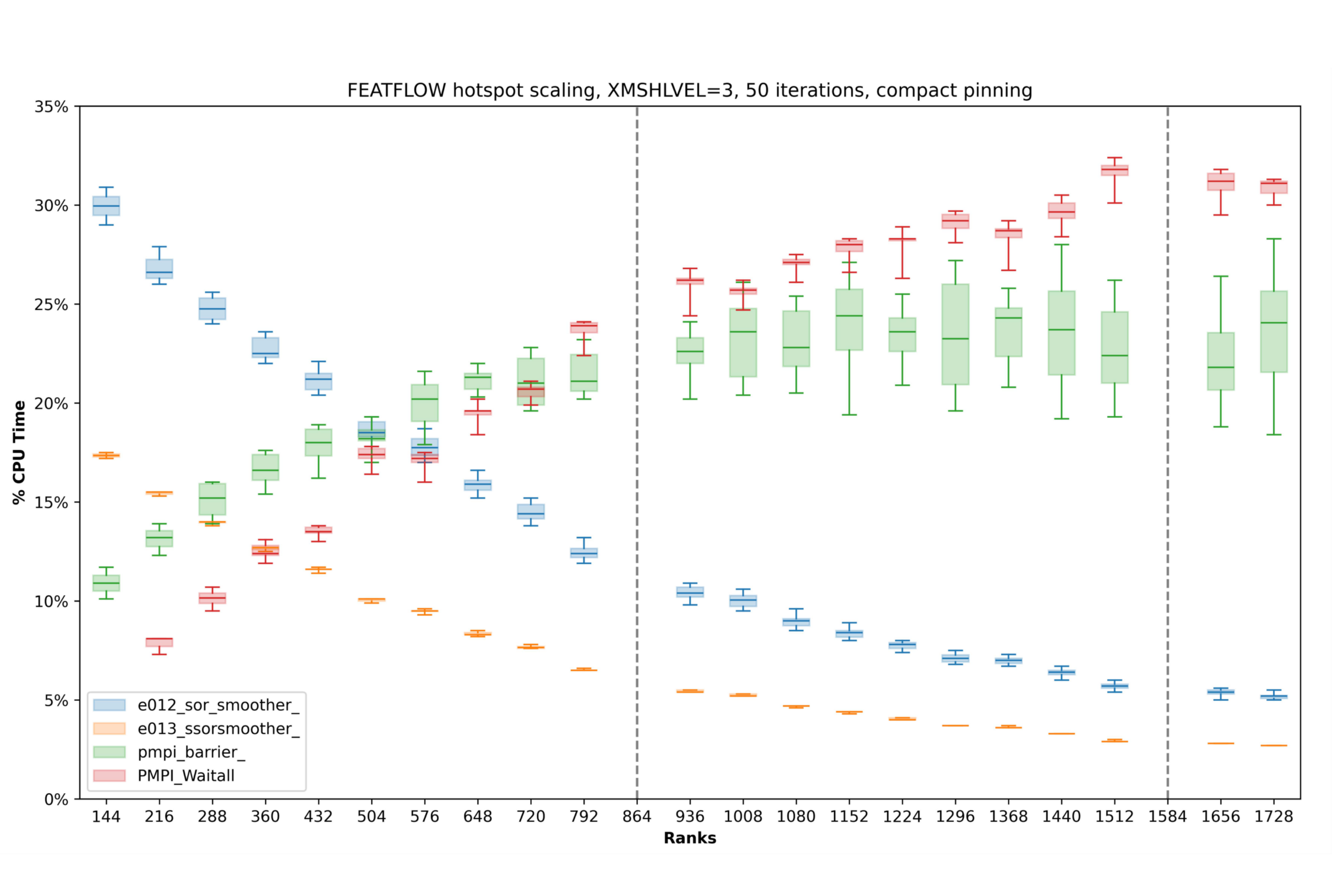 Within the StroemungsRaum project, new and extended solver approaches for spatially and temporally parallel flow simulations were developed, ported to modern HPC and GPU architectures, and incorporated into both the FEATFLOW and StrömungsRaum® codes. Performance analysis revealed that the SOR multigrid smoothing routines in FEATFLOW constituted the primary bottleneck at low MPI process counts. As process counts scaled up, global MPI barriers became increasingly dominant, accounting for the majority of runtime beyond 1000 processes.